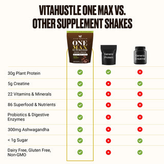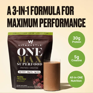 30g of complete plant protein, 5g of creatine monohydrate, and a powerful superfood blend with probiotics and adaptogens, ONE MAX fuels peak athletic performance in every scoop. This 3-in-1 formula is built for those who demand more — more strength, more endurance, and more results.